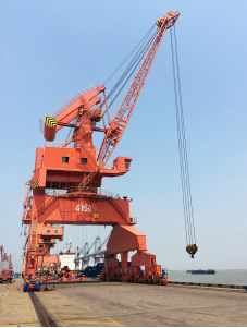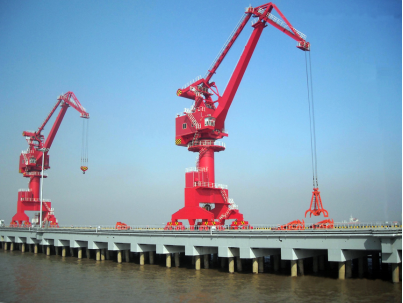 港口門(mén)座式起重機(jī), 吊鉤/抓斗兩用,適用于散貨卸船(煤炭、糧食、砂石、礦石等)以及件雜貨(鋼卷、噸包、紙漿、船廠舾裝件吊裝等)。吊鉤作業(yè)額定起重量5t~250t,散貨作業(yè)效率150t~1200t/h。